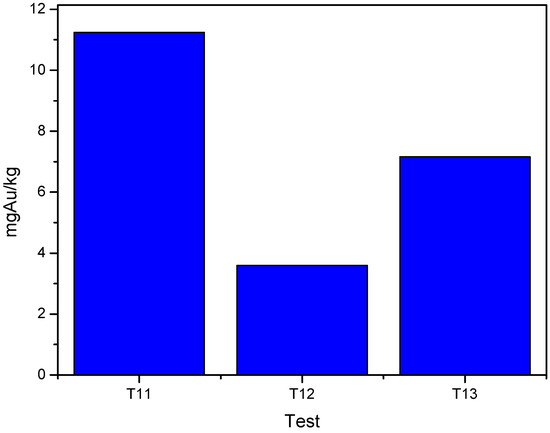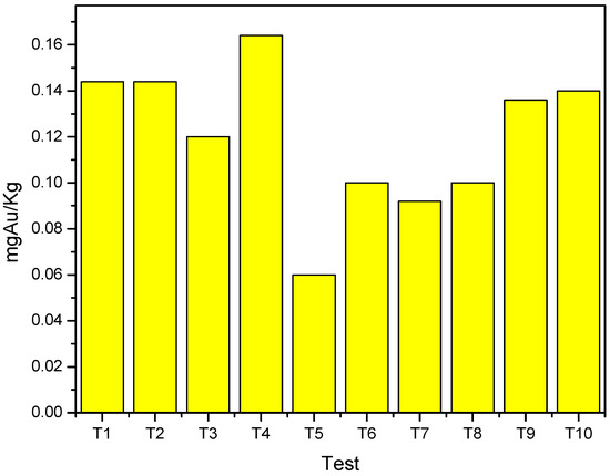 Figure 1 shows the gold losses in the excess ratio tests. The average percentage loss was 6.784%, while the total average loss in ppm was 0.446. The T1, T2, and T3 samples that used the natural solution did not show results significantly different from the other tests. Likewise, the samples with different granulometry did not show significantly different results from those with normal granulometry. This phenomenon could explain why, although there are different contact surfaces, preg-robbing would occur anyway. Increasing the proportion of lime, which interacts with the gold to precipitate it (presumably due to activated embedded carbon/silicates), may also have increased gold loss in the solution. The higher proportion of quicklime compared to the levels used in industrial cyanidation was responsible for the rate of gold retention.