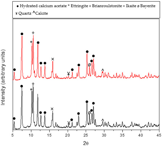 Figure 6 shows the X-ray diffraction analysis of qlvk and qlrk. The main phase detected consisted of hydrated calcium acetate [(CH3COO)2Ca·H2O], which diffracted in most of the peaks, especially at 7.30°, 10.72°, 11.88°, 14.51°, 15.95°, 23.45°, 25.95°, and 27.62° 2θ, according to the reference pattern 00-019-0199 [24]. Other phases identified were ikaite (CaCO3·6H2O) at 17.19° 2θ [25] and brianroulstonite [Ca3[B5O6(OH)6](OH)Cl2·8H2O], with a main peak at 10.92° 2θ [26]. Calcite (CaCO3) diffracted at an angle of 29.48° 2θ [27], while ettringite [Ca6Al2(SO4)3(OH)12·26H2O] presented a main peak at 9.76° 2θ [27]. Other peaks detected were bayerite [Al(OH)3] at 27.70 2θ [28] and quartz (SiO2) at 20.22° 2θ [29]. Some peaks were not verified completely, perhaps due to “noise” detected by the equipment.