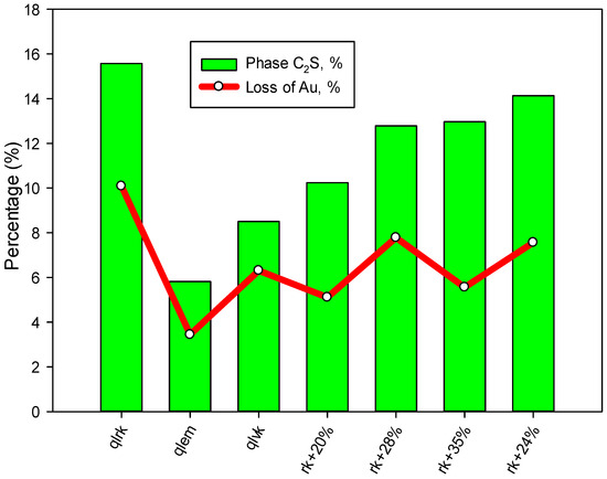 Figure 9 shows the following correlation: as the amount of C2S (dicalcium silicate 2CaO-SiO2) in the qlrk and qlvk samples increased, the loss of gold also increased, while a decrease in C2S resulted in reduced loss, as occurs in the case of qlem. With respect to rk + 20%, rk + 28%, rk + 35%, and rk + 24%, there were slight variations between the two values analyzed.