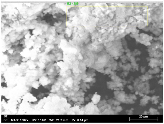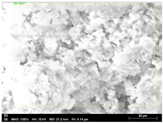 Scanning electron microscopy–energy dispersive spectroscopy (SEM-EDS) analyses were performed using Hitachi SU8230 equipment (Hitachi, Tokyo, Japan) to determine the morphology, structure, and quicklime composition of T14 after the gold retention test. The cold cathode technique was used with the quicklime that was adhered to the sample holder by copper tape. The conditions for taking the images involved applying an energy of 6 kV and 5 μA at a working distance of 2.2 mm.