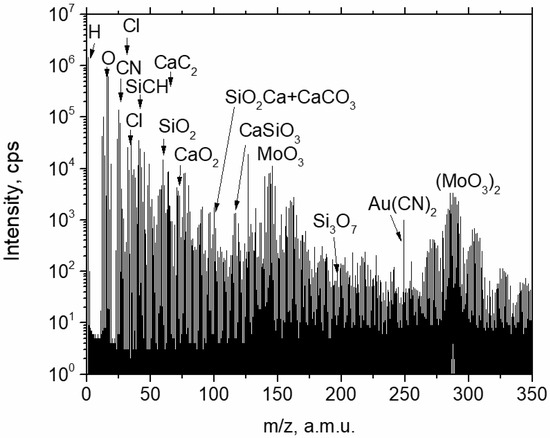 Figure 13 shows a fragment of the negative ion mass spectrum (from 1–350 a.m.u.) of the T16 sample. The mass spectra for the other two samples are almost identical. Slight differences are visible in the intensities of the peaks that correspond to distinct elements and clusters (fragments of molecules). In addition to the main components (H, C, O, Si, and Ca), the figure shows some clusters with maximum intensity. Elements indicative of contamination, such as F, Cl, and Mo, are also observed among the peaks. Molybdenum was clearly detected because molybdenum foil was used to embed the samples in indium. The complex composition of the targets made it impossible to identify all the peaks in the mass spectra, but this task was not included in the study protocol. For obvious reasons, special attention was paid to identifying the gold peak and those that corresponded to the compounds of gold atoms in the elemental form (Au) or compound Au(CN), Au(CN)2, as well as elements that had the potential to perform preg-robbing, that is, carbon calcium oxide and silicates.