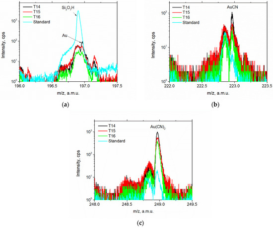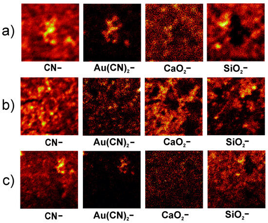 These findings lead to the conclusion that stable Au(CN)2− complexes were detected in Figure 14c in all three samples (T14, T15, T16). No clusters containing gold atoms bonded to SiO or CaO were observed. The distributions of Au−, AuCN−, and Au(CN)2− were similar, suggesting the formation of a stable gold cyanide compound (Au(CN)2).