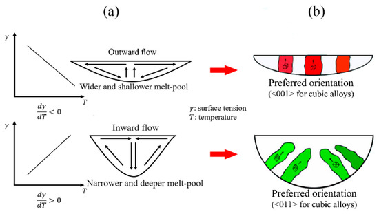 (a) The effect of Marangoni on the melt pool geometry based on the melt chemical composition, reprinted from Ref. [33] and (b) the influence of the melt pool geometry on the preferred orientation in alloys with a cubic crystal structure, reprinted from Ref. [34].