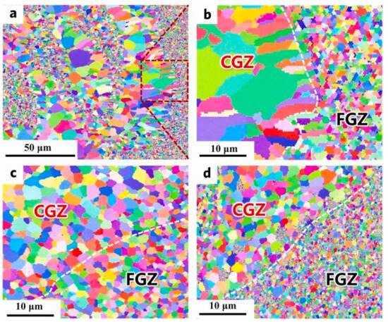 Some alloy design strategies rely on forming secondary phases for microstructure modification, rather than rejecting solutes into the liquid. The varying solidification rate throughout the solidification process is usually a key point when in situ intermetallics are employed as nucleation sites. Xu et al. [38] produced Al–Fe–Cu–xZr alloys (x = 0.6, 0.8, and 1.3 at %) via the LPBF method. The feedstock was prepared via the induction of the melting of the associated ingots, followed by atomizing to prepare the powders. EBSD results are shown in Figure 6, where it can be noticed that the majority of the grains in both fine grain zones (FGZs) and coarse grain zones (CGZs) are equiaxed, except for the Al–Fe–Cu–0.6Zr alloy in CGZs, which exhibits a minor columnar characteristic. It can also be noted that the grain size in CGZs and FGZs decreased as the Zr concentration increased.
