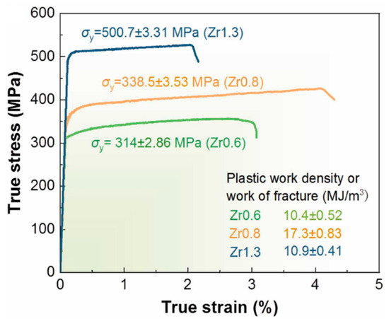 Perhaps the main point is that Al3Zr precipitates that developed close to the melt pool border served as Al grain nucleation sites, resulting in FGZs. On the other hand, the Al3Zr precipitation was suppressed as the solidification rate increased with the development of the solidification front, resulting in the formation of CGZs inside the melt pool [38]. The true stress–strain curves of the three Al alloys produced by Xu et al. [38] under uniaxial tension are illustrated in Figure 7. The yield strength (σy) increased with Zr content. CGZs and FGZs decreased with increasing Zr content (Figure 6), a behavior that explains the trend observed in Figure 7.