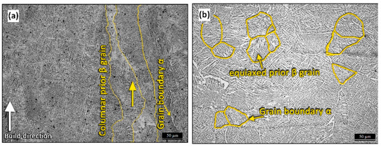 Employing the same solidification effect, Mantri et al. [44] altered the columnar texture of AM β-Ti alloys by adding trace amounts of boron. According to the results, the morphology of α precipitates from lath-like to more equiaxed when boron was added to a Ti-12 wt.% Mo alloy (Figure 4).