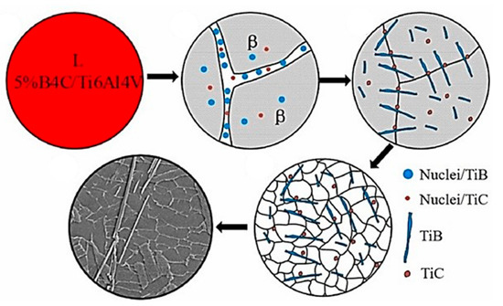 Schematic illustration of intermetallic formation and grain refinement due to the rejection of B and C in Ti liquid during the (TiB + TiC)/Ti solidification process, reprinted with permission from Ref. [51]. 2023, Elsevier.