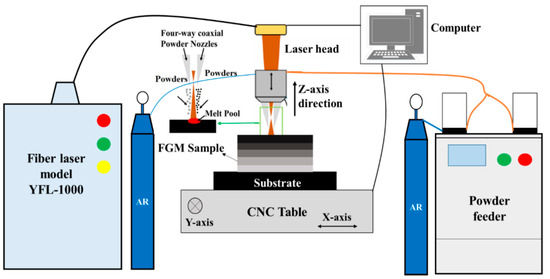 Schematic of the L-DED process with separate powder feeders to fabricate FGMs, reprinted from Ref. [67].