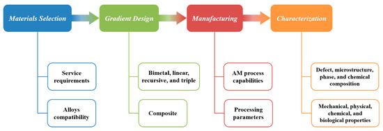 It should be highlighted that, in order to apply any gradient design, the AM process must first support the necessary capabilities; for example, the DED and PBF systems must be equipped with separate powder feeders and powder-spreading mechanisms to deliver the materials according to the gradient design. Second, the various features of each gradient step necessitate the adoption of specific optimal processing parameters to prevent defects (e.g., porosity, residual stress, etc.). For this purpose, applying online feedback systems, numerical modeling, and machine learning approaches might be helpful. Finally, like other production processes, quality control of the final part is required to ensure the intended performance under physically simulated service conditions, esp. corrosive environments, as well as dynamic and multi-axial loading, to which less attention has been paid in the literature and often focused on the FGMs design and fabrication.