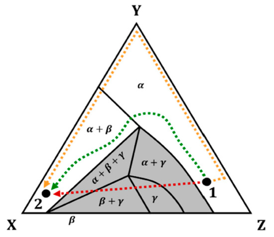 Application of isothermal ternary phase diagram for gradient design between terminal alloys 1 and 2. The yellow and green dotted lines as binary and arbitrary paths, respectively, avoid a detrimental γ phase, in contrast to the linear gradient (red dotted line), reprinted from Ref. [75].