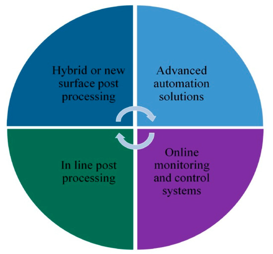 AM enhances metallurgical and mechanical properties and productivity compared to traditional methods [21,22]. On the other hand, the metallurgical advantages of AM extend to the production of large components in various metals, such as Ti, Al, and steel, utilizing techniques like Wire Arc Additive Manufacturing (WAAM) [8]. In addition to its benefits in large-scale manufacturing, AM’s intrinsic manufacturing flexibility enables the production of small batches of end-products following customers’ demands [23,24]. Regarding specific materials, AM has been a game-changer in the manufacturing of Ti alloys, altering the design and manufacturing landscape [1]. In terms of applicability, AM has been successfully applied to produce complex products with high precision, such as metal surgical guides, which serve as an affordable adjunct to oral and maxillofacial surgery [25], with dozens of other implemented applications reported for aerospace and automotive sectors [1,26].
