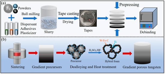 Flow chart for the preparation of gradient porous tungsten: (a) preparation of gradient blanks and (b) sintering and dealloying.