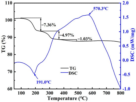 Figure 3 shows the TG-DSC curves of the W-Ti-Fe cast vein sheet. From the TG curve in Figure 3, it can be seen that when the debinding temperature is gradually increased to about 200 °C, the mass loss ratio of the W-Ti-Fe tape sheet is 7.36%, which is mainly due to the volatilization of the organic residual solvents (butanone and ethanol) in the tape. In addition, an obvious heat absorption peak at 191.0 °C can be found in the DSC curve, which also proves the volatilization phenomenon of organic residual solvents. When the debinding temperature was gradually increased from 200 °C to 300 °C, the mass loss ratio of the W-Ti-Fe tape was 4.97%, which was attributed to the fact that the long polymer chains of the organics in the cast sheets were gradually broken to form short chains during this temperature period. In the temperature interval from 300 °C to 500 °C, the remaining polymer long chains in the tape continued to decompose, and the mass of the tape decreased slowly with a mass loss ratio of 1.03%. In addition, observing the DSC curves, an obvious exothermic peak exists near the region of 570.3 °C, which may be attributed to the chemical reaction of W and C elements in the tape near this temperature. In order to prevent the residual carbon from pyrolysis in the debinding process from reacting with metal elements such as W to form impurity phases, the maximum temperature in the debinding process is set to be no more than 500 °C.