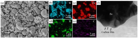 SEM images of W-Ti-Fe mixed powder (a); EDS elemental maps of W (b); Fe (c); Ti (d); C (e); and TEM image of W-Ti-Fe mixed powder (f).