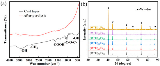 (a) FT-IR patterns of W-Ti-Fe cast tapes and mixed powder after pyrolysis; (b) XRD patterns of W-Ti-Fe mixed powder after pyrolysis.
