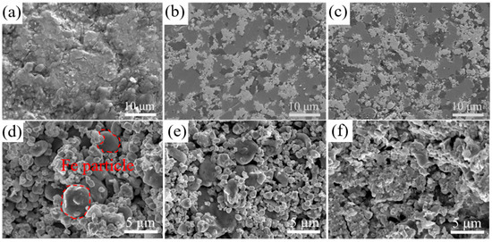 Figure 6 shows the SEM micromorphology of the polished surface and section of the W-Ti-Fe precursor at different SPS temperatures. It can be seen from Figure 6a–c that when the sintering temperature is 700 °C, the surface of the polished W-Ti-Fe precursor is peeled off, and when the sintering temperature is increased to 750 °C and 800 °C, the compounds formed by the reaction of the interface region of W and Fe phases play a role in bonding the matrix particles and increasing the relative density of the precursor [20]. As can be seen from Figure 6d, when the SPS temperature is 700 °C, the matrix particles of the precursor show weak neck connections and maintain more pore structure. As the sintering temperature increases to 750 °C, the bonding phase formed by the reaction at the interface between the W and Fe phases makes the matrix particles contact more tightly and firmly, as shown in Figure 6e. When the sintering temperature reaches 800 °C, a large number of adhesive phases eventually lead to a significant increase in the relative density of the precursor, which forms a coating structure coated with Fe particles, which can weaken the transport of dealloying media such as dilute sulfuric acid or hydrofluoric acid in the porous channel, thereby reducing the dealloying efficiency, as shown in Figure 6f. Therefore, 750 °C was chosen as the sintering temperature for the W-Ti-Fe precursor.