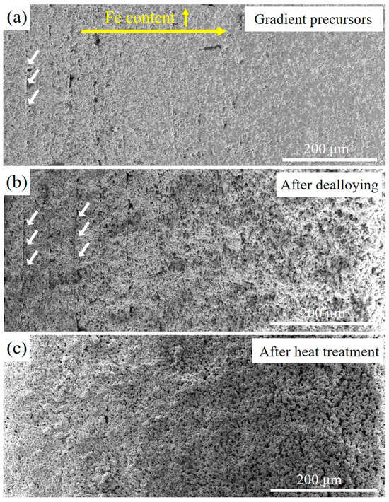 SEM images of (a) W-Ti-Fe precursor, (b) prefabricated porous framework, and (c) W-Ti composite framework with gradient Fe content or porosity distribution. The white arrows indicate the interface between the different layers.