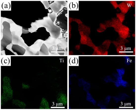 Figure 7b shows the microstructure of the prefabricated porous skeleton, which consists of a W-Ti composite ligament together with the pore structure; the ligament structure consists of three phases, namely, the W phase, the Ti phase, and the W-Fe-C compound phase, and the presence of the W-Fe-C compound phase enhances the interfacial bonding strength between particles in the ligament, which is capable of preventing the prefabricated porous skeleton obtained after dealloying from collapsing. In addition, the melting point of Ti is much lower than that of W. After the low-temperature sintering of the precursor, the W-Ti interface has a stronger bonding ability than the W-W interface, so the introduction of the Ti phase in the precursor can also enhance the stability of the ligament structure of the prefabricated porous skeleton. The low-Fe content region in the precursor corresponds to the low-porosity region in the prefabricated porous skeleton, and it can be found that the delamination phenomenon still exists in the prefabricated porous skeleton in the low-porosity region.