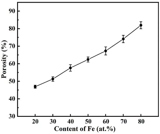 Figure 10 illustrates the porosity of a monolayer porous tungsten material prepared with the same process parameters to estimate the range of the porosity variation of gradient porous tungsten. It can be found that with the increase of Fe content from 20 at.% to 80 at.%, the porosity of porous tungsten specimens increases from 46.9% to 81.9%.