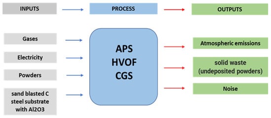In this investigation, measurements of energy consumption, metal powders, gas emissions, and noise in the spraying booth were conducted in real time during the process deposition using an ammeter clamp Iberica PCE-PCM1 with USB port and software. Moreover, a CO2/CO DELTA OHM HD21ABE17 meter was used to measure the gases generated, with the following ranges: CO2 0–5000 ppm; CO 0–500 ppm. Finally, the SC102 Class 2 sound level meter was used for noise measurement. To generate the LCI for the APS, HVOF, and CGS deposition processes, the LCI of WC-12Co was utilized as the raw material. The WC-12Co feedstock powder dataset was readily accessible in the Ecoinvent database. It is crucial to have a distinct LCI available for each unit process (UPR) or gate-to-gate inventory within a supply chain []. Based on the UPR, LCI, and LCIA unit process presented in Ecoinvent database [], Figure 1 lists the inputs (exchanges from environment and intermediate exchanges); the process or activity; and the outputs (reference product, by product waste, and exchanges to environment).