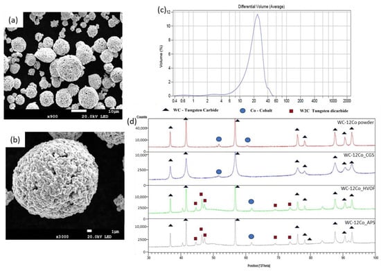 SEM image of WC-12Co feedstock powder at (a) low and (b) high magnification. (c) Particle size distribution. (d) XRD diffractograms of feedstock powder and coatings.
