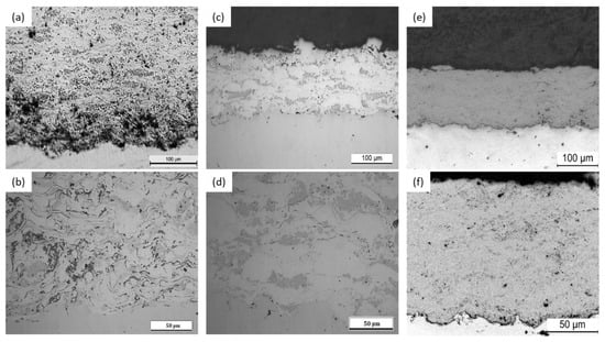 OM images of (a,b) APS, (c,d) HVOF, and (e,f) CGS coating.