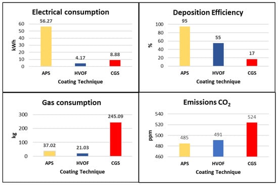 Electrical consumption, deposition efficiency, gas consumption, and CO2 emissions of APS, HVOF, and CGS coating.