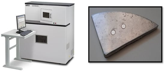 Identifying the precise cause of casting defects, particularly intricate issues like shrinkage porosity, is especially challenging in practical applications. Therefore, conducting a detailed material characterization becomes imperative. The initial step involves examining the chemical composition of the casting to confirm its alignment with the specifications for AISI 316L austenitic stainless steel. This analysis utilized the optical emission spectrometer GDS 850A, LECO (St. Joseph, MI, USA), as depicted in Figure 3.
