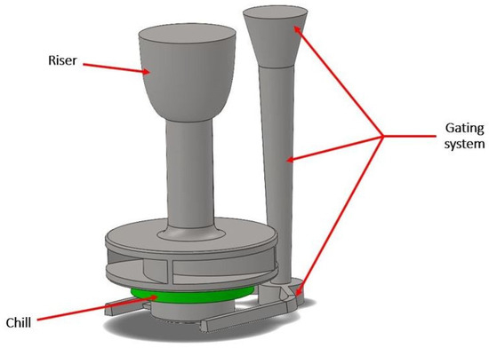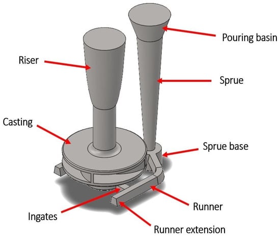 The gating and feeding systems were also designed identically. In this way, an identical shape was achieved as in the real experiment. The gating system consisted of a pouring basin, sprue, sprue base, two runners, and two ingates, while the feeding system, represented by the riser, was positioned at the top of the pump impeller shaft. The vertical distance between the molten metal level in the pouring basing and the ingates level was 370 mm. The cross section of the bottom of the sprue was 315 mm2, the runner was 2 × 270 mm2, and the ingates were 2 × 150 mm2. The gating and feeding system for the impeller pump in the form of a CAD model with labeled parts is shown in Figure 5.