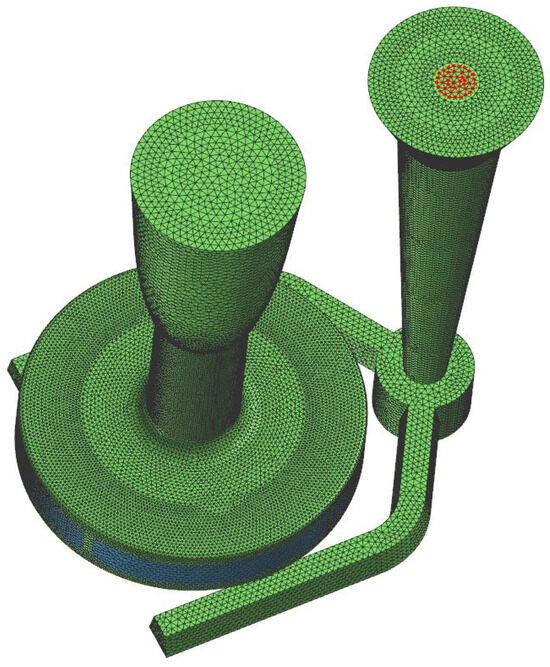 The CAD model was imported into the ProCAST casting simulation software. The mesh was generated by the finite element method with the densest mesh on the casting (pump impeller), followed by the gating system then the rise and core, and finally the mold with the rarest generated mesh. Figure 6 shows the distribution of the generated mesh without molds. The final number of 2D and 3D elements was 2,028,526.