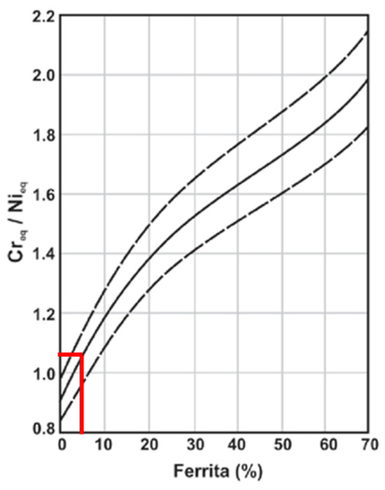 The Schoefer diagram, constructed with the calculated chromium and nickel equivalent composition ratio, is depicted in Figure 8. The Cre/Nie composition ratio is 1.05, which results in a Ni content of approximately 5% in the microstructure.
