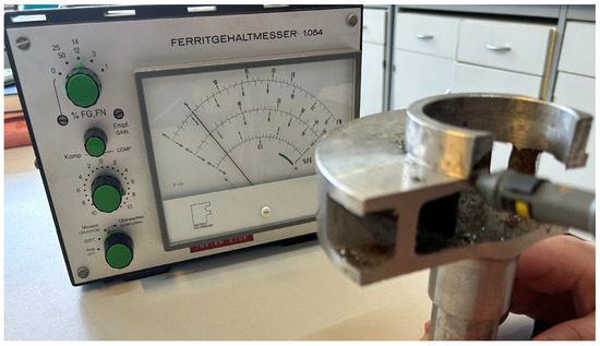 The accuracy of the Schoefer diagram was determined using a ferritometer. Figure 9 displays the testing of ferrite content in the austenitic microstructure with device Ferritgehaltmesser 1.054. The device measured a ferrite content of 5%, thereby validating the results obtained in the Schoefer diagram.