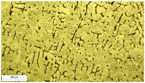 The chemical composition was tested and deviations were found for some chemical elements. Cr, Ni, and Mo levels are slightly lower than required by the standard for AISI 316L steel (Table 1). P and S levels are slightly higher and the Si level is higher than required. The reduced chromium content in the casting can lead to a reduction in corrosion resistance, as chromium is a critical element for forming a protective oxide layer. Chromium is an alpha-forming element that expands the range of ferrite stability, influencing the microstructure and potentially affecting mechanical properties. Conversely, nickel and manganese are highly gamma-forming elements, imparting stability and broadening the austenitic phase field. Nickel contributes to corrosion resistance and enhances ductility, while manganese can impact hardenability.