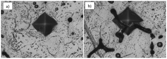 Microhardness measurement indentations: (a) predominantly austenitic phase; (b) predominantly ferritic phase.