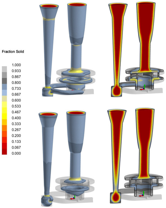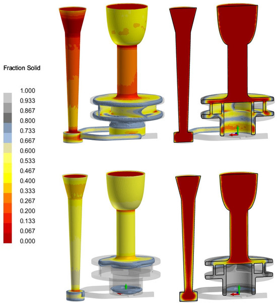 The next analysis concerns the solidification process of the molten metal in the mold cavity. The critical areas in the mold cavity are those that solidify last, so the feeding systems were arranged to compensate for volume loss. Thin sections in contact with the mold should solidify first, then thicker sections and the riser at the end, which is called directional solidification. In Figure 14, it can be seen that the directional solidification towards the riser was not achieved. Since the lower side of the pump impeller was no longer fed by the riser, the possibility of casting defects was expected in this area.