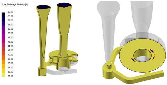 Further analysis was performed to determine the occurrence of shrinkage porosity in the casting. Figure 18 shows the parts of the casting where shrinkage porosity occurred. This time, the shrinkage porosity did not occur at the entrance of the pump impeller, which was a great improvement. The lower part of the shaft indicates the presence of porosity, but it has already been mentioned that this area is not part of the casting. The results of the numerical simulation show that with this improvement it was possible to obtain a high-quality casting without casting defects.