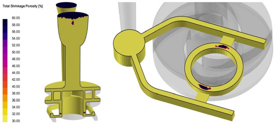 In the ProCAST software, it is possible to estimate the probability of casting defects. Figure 15 shows the probability of shrinkage porosity, revealing its occurrence at the point where the melt enters the pump impeller. The analysis indicated that the probability of casting defects in this area exceeded 60%. Consequently, numerical simulations were found to accurately predict casting defects at the same location observed in the actual casting process.