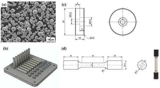 Figure 1a, showing that the powder was predominantly spherical. The chemical composition (wt.%) is as follows: [50.60] Ni, [18.40] Cr, [4.80] Nb, [2.93] Mo, [0.96] Ti, [0.54] Al, [0.040] Co, [0.046] Mn, [0.078] Si, and [0.042] C, with the remaining balance being Fe. Tensile specimens and analysis specimens (30 mm in diameter, 10 mm in height) were fabricated in two orientations, horizontal and vertical, to compare their mechanical properties along the gradient of the build direction.
