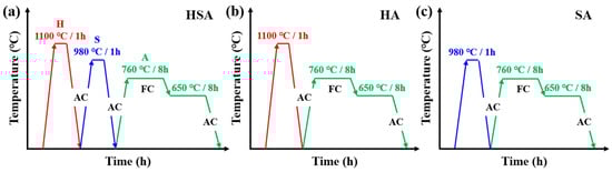 Table 2. The double aging treatment listed in all cases was 760 °C (8 h) followed by furnace cooling, then 650 °C (8 h) followed by air cooling temperature. The homogenization treatment and solution treatments involved holding at 1100 °C for 1 h and holding at 980 °C for 1 h followed by air cooling, respectively. The homogenization treatment was conducted at 1100 °C for 1 h, while the solution treatment (S) involved holding at 980 °C for 1 h, followed by air cooling. Aging treatment (A) for precipitation hardening involved two consecutive stages to precipitate strengthening phases (γ′ and γ″). This was carried out by holding at 760 °C for 8 h, followed by air cooling at 650 °C for 8 h. In nickel-based superalloys, secondary aging after primary aging forms finer precipitates, enhancing high-temperature strength. Therefore, four heat-treated specimens were prepared: AB, HSA, HA, and SA. The AB specimen is as-built specimen without any heat treatment. The HSA specimen was crafted from an as-built sample, undergoing homogenization treatment at 1100 °C for 1 h with air cooling (AC). Subsequently, it underwent solution treatment at 980 °C for 1 h with air cooling (AC), followed by a double aging process: first at 760 °C for 8 h with furnace cooling (FC), and then at 650 °C for 8 h with air cooling (AC). HA and SA specimens were also heat-treated using a specific heat treatment combination. The horizontally-built/vertically-built AB, HSA, HA, and SA samples were designated as H-AB/V-AB, H-HSA/V-HSA, H-HA/V-HA, and H-SA/V-SA, respectively.