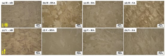 Figure 5c,g) specimens due to the homogenization treatment, with a more pronounced growth in microstructure compared to the AB specimens (