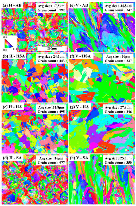 Figure 5, the EBSD microscopy images depict the microstructure of post-heat-treated specimens according to different build orientations. Compared to the V-AB state, in H-AB (