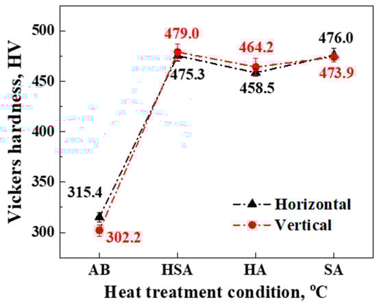 Figure 6 shows the Vickers hardness values of each sample. Heat-treated specimens demonstrate an approximately 52.57% increase in hardness compared to AB specimens. Notably, HSA exhibits the highest hardness among different heat-treated specimens, with measurements of 475.3 HV for the horizontal specimen and 479 HV for the vertical specimen. The reason for this is that in HSA, the δ-phase is finely distributed within both grain boundaries and grains. Additionally, needle-δ phase precipitates on particles can fix the grain boundaries and impede their movement, consequently enhancing the hardness of the alloy [