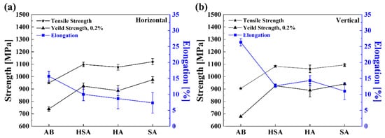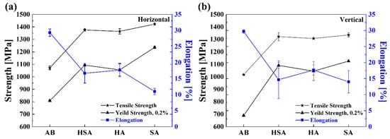 Figure 4d,h) did not show any Laves phases. Conversely, both HSA and SA specimens with a vertical building direction showed an elongation of 14%, with tensile strengths of 1322.5 MPa and 1336 MPa, and yield strengths of 1091.6 MPa and 1126.3 MPa, respectively, indicating similar tensile properties. Different mechanical properties are observed due to the varying direction of tensile loading depending on the building direction. This is attributed to the anisotropy arising from the shape of the dendrites and the direction of grain growth within the melt pool. When tensile loading is applied perpendicular to the building direction, more grain boundaries are encountered. Grain boundaries hinder the movement of dislocations, implying that materials with a horizontal building direction demonstrate superior tensile strength and yield strength.