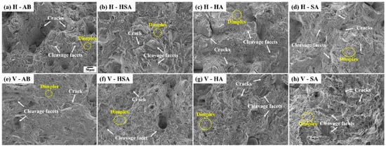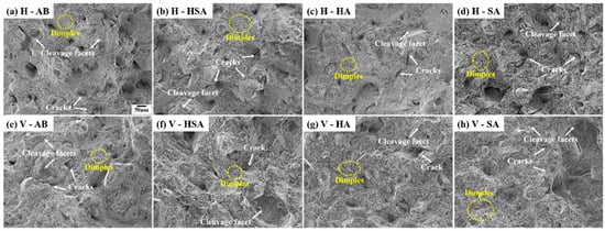 Figure 10b–d,f–h) showed finer cracks and smaller cleavage facets compared to the AB specimens. As a result, it can be inferred that the high-temperature strength was higher in these specimens. Specimen V-HA exhibited larger dimples compared to V-HSA, resulting in a higher elongation. In