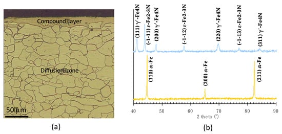 (a) Cross-section micrograph obtained after nitriding of the Fe-1.5wt%Si sample at 570 °C for 8 h; (b) X-ray diffraction pattern associated. The compound layer on the surface is composed of γ’-Fe4N and ε-Fe2-3N, and the diffusion zone underneath by α-Fe.