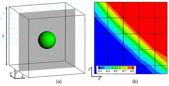 (a) Three-dimensional representation of a particle/matrix system into the simulation box of length L and 2D visualisation of the mesh grid in the (100)-plane; (b) 2D visualisation of the phase function ϕ discriminating the matrix (blue color) from the particle (red color). At the interface, the ϕ-function varies continuously. The location of the interface is defined for with the full line in black color.