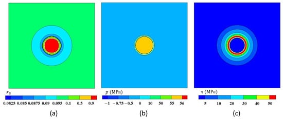 Maps within the three equivalent middle planes , , and at dimensionless time of (a) molar fraction of B-atoms; (b) pressure. Note that the positive value of pressure corresponds to compressive pressure, whereas negative value corresponds to tensile pressure.; (c) Normalized shear stress.