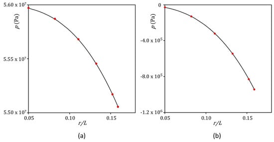 Evolution of the pressure characteristics in the system as a function of the dimensionless particle radius r/L at (a) the -point located in the β-precipitate; (b) the -point located in the α-matrix. This evolution was compared for some volume fractions (red dots) to that obtained analytically from Scherer’s model, adapted from Ref. [35].