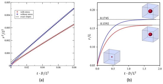Comparison of the particle growth kinetics. The blue curve and the red curve correspond, respectively, to the unstressed and stressed cases: (a) Evolution of the square of the dimensionless particle radius as a function of dimensionless time. (b) Evolution of the dimensionless particle radius.The dashed line corresponds to the final equilibrium values.