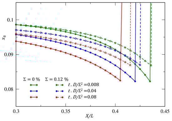 Comparison of the atom fraction profiles of B-atoms within the α-phase along the three equivalent middle lines, the (X/L, Y/L = 0.5, Z/L = 0.5)-line, (X/L = 0.5, Y/L = 0.5, Z/L)-line, and (X/L = 0.5, Y/L, Z/L = 0.5)-line during the particle growth. The solid lines and the dashed lines correspond to the unstressed and stressed cases, respectively.